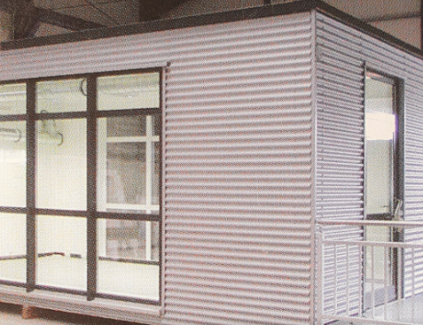 - verzinktes Stahlgerippe, Außenverkleidung mit ver-zinkten Profilblechen, Mineralwoll-Dämmung 60 mm nach DIN 4102, Wärmeleitfähigkeitsgruppe 040, Brandschutzklasse A2, Innenverkleidung aus beidseitig melaminharzbeschichteten Holzwerkstoffplatten (E1), weiß oder kiefer. Stöße mit farbig passenden Kunst-stoffprofilen versehen.